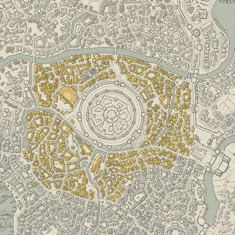 Esta área central y exclusiva de la ciudad alberga a los adinerados y poderosos, circundando majestuosamente el palacio principal. Vigilada con la mayor presencia de guardias, este sector representa la cúspide de la sociedad y es reconocido por su opulencia y seguridad.En sus calles empedradas y cuidadosamente diseñadas, se alzan imponentes mansiones y lujosas residencias. Las plazas están decoradas con exquisitas fuentes y jardines meticulosamente cuidados, creando un ambiente de refinamiento y distinción.